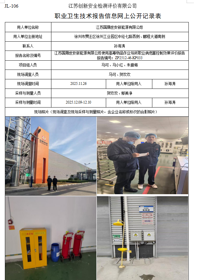 江苏国晟世安新能源有限公司使用高毒物品作业场所职业病危害控制效果评价报告