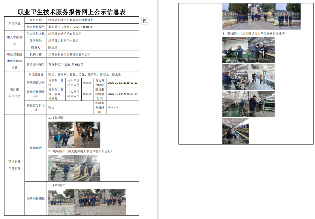 洪泽县宏港毛纺有限公司2026年度职业病危害现状评价报告