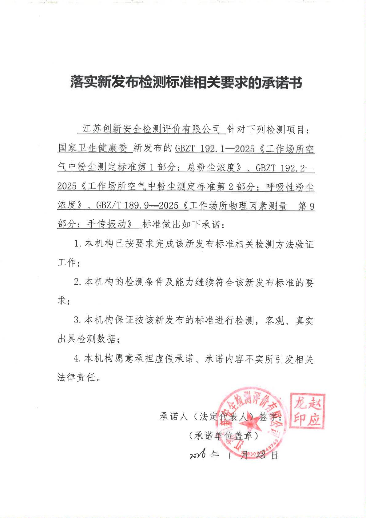 落实新发布检测标准相关要求的承诺书(总粉尘浓度、呼吸性粉尘、手传振动)
