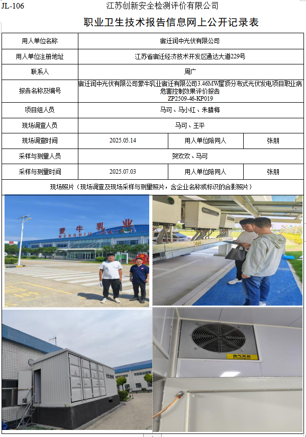 宿迁润中光伏有限公司蒙牛乳业宿迁有限公司3.46MW屋顶分布式光伏发电项目职业病危害控制效果评价报告