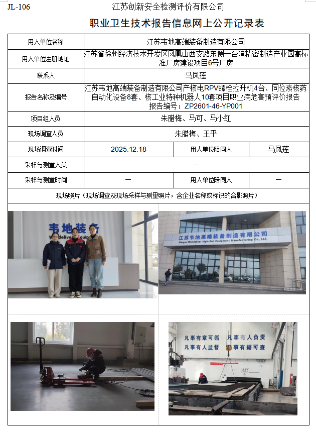 江苏韦地高端装备制造有限公司产核电RPV螺栓拉升机4台、同位素核药自动化设备8套、核工业特种机器人10套项目职业病危害预评价报告