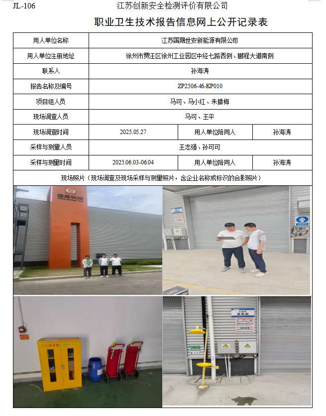 江苏国晟世安新能源有限公司使用高毒物品作业场所职业病危害控制效果评价报告