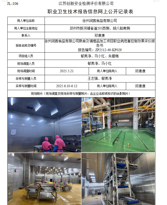 徐州润客食品有限公司熟食及调理品加工项目职业病危害控制效果评价报告书