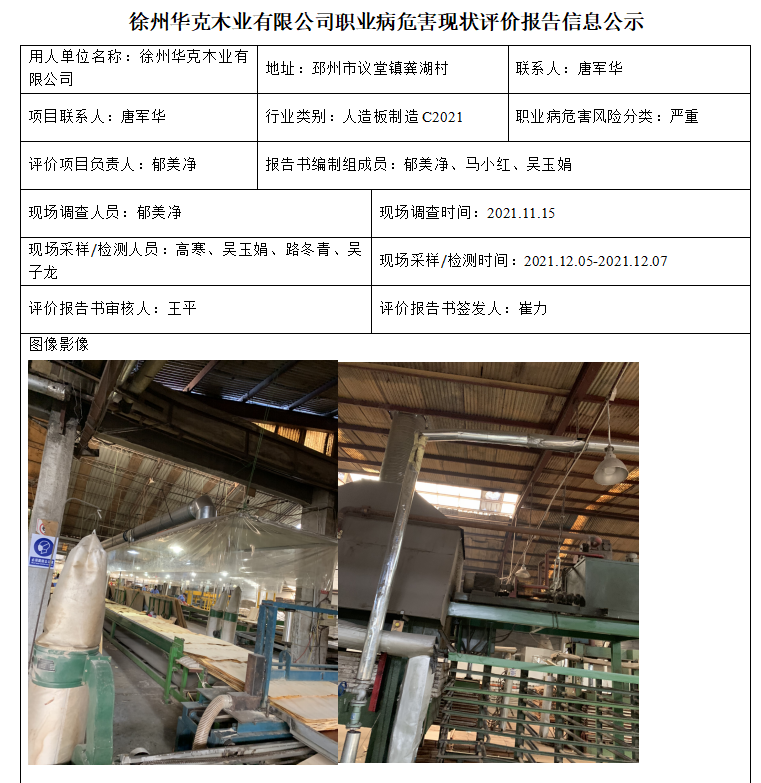 徐州华克木业有限公司职业病危害现状评价报告信息公示
