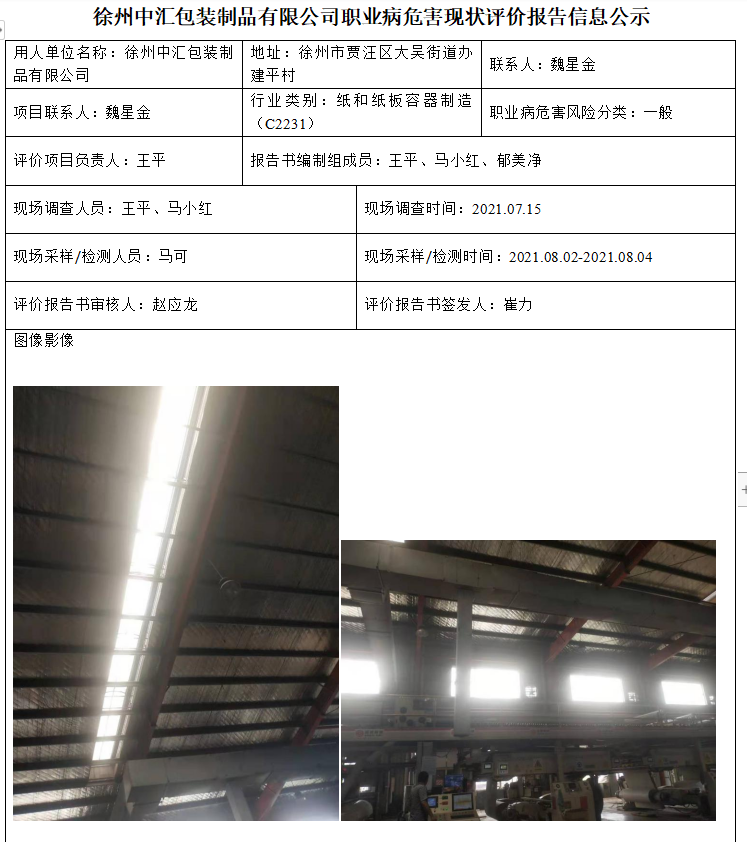 徐州中汇包装制品有限公司职业病危害现状评价报告信息公示